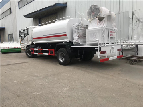 7、東風天錦抑塵車標配前沖(噴)后灑,灑水寬度≥14米,帶側噴,罐體后帶工作平臺,平臺上安裝綠化灑水炮,灑水炮可全方位旋轉,射程≥28米,可連續調成直沖狀、大雨、小雨、毛毛雨,帶安全護欄,配備專用灑水泵,