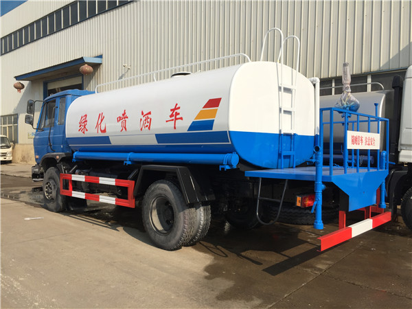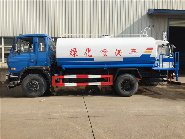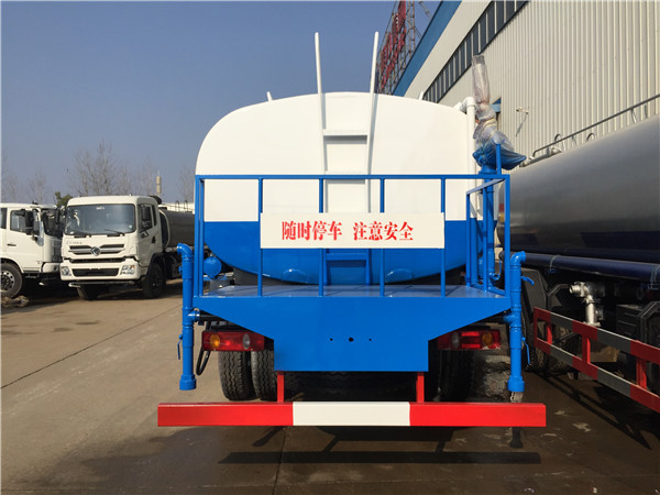 東風145多功能灑水車主要由汽車底盤、水罐、取力器、灑水泵、管網系統、后工作平臺等組成,其中,灑水車后工作平臺上主要安裝有綠化灑水高壓炮,側噴,后灑等噴灑裝置,工作平臺主要由3mm防滑板制作,還有方便上下平臺的用鋼筋與角鐵焊接的簡易踏步,和保證灑水車工作人員在操作灑水炮過程中的人身安全的防護欄,防護欄上一般設有警示標語,上面噴涂“隨時停車,注意安全”等字樣,提醒后車注意減速或避讓,與工作平臺后部相連的則是底盤防撞護欄。