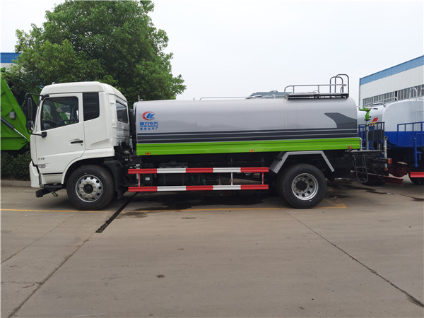 東風天錦灑水車標配前沖(噴)后灑,灑水寬度≥14米,帶側噴,罐體后帶工作平臺,平臺上安裝綠化灑水炮,灑水炮可全方位旋轉,射程≥28米,可連續調成直沖狀、大雨、小雨、毛毛雨,帶安全護欄,配備專用灑水泵,