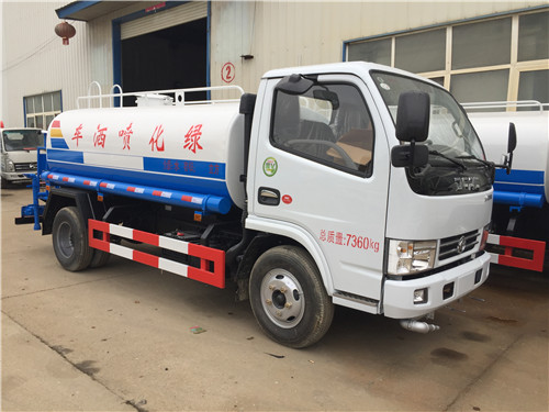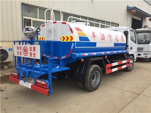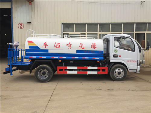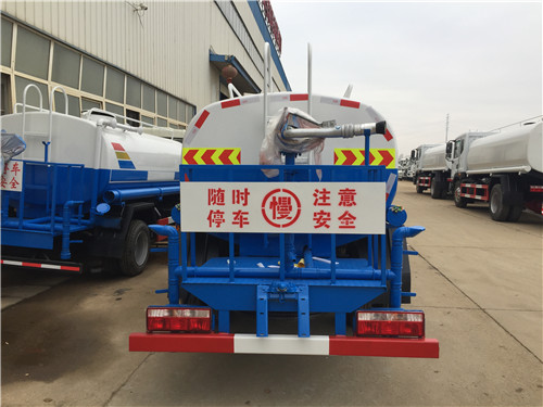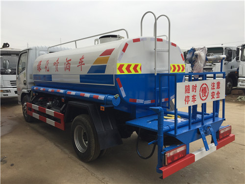 灑水車的基本配置:罐體用4MM碳鋼板制作,罐內隔板具有防波作用,以減低灑水車行駛時罐體液體的沖擊。整車帶一個專用灑水泵(垂直最大吸程6米),灑水寬度14米,射程28米。灑水車配備2個前沖(噴)(能將路面泥巴、塵土、垃圾沖干凈);2個后灑(能均勻地將水灑在路面,一次灑水寬度14米)、2個側噴(花灑)(能均勻地將路旁綠化帶澆灌)、帶1個后工作平臺,平臺上安裝1個綠化灑水高炮(灑水炮可全方位旋轉,可連續調成直沖狀、大雨、小雨、毛毛雨,霧狀可調節沖洗高大樹木),引水時間<5min,流量90m3/h。帶1個消防接頭,帶1個自流閥,1個過濾裝置、人性化爬梯及側防護欄,安裝灑水音樂喇叭。